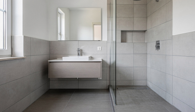 Aus den Bodenfliesen wurden passend zugeschnitten Akzente in der Dusche, Nische und Wand gesetzt.