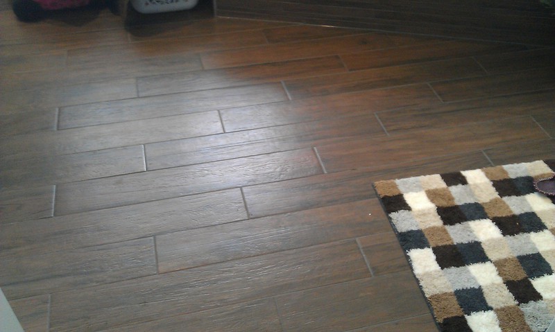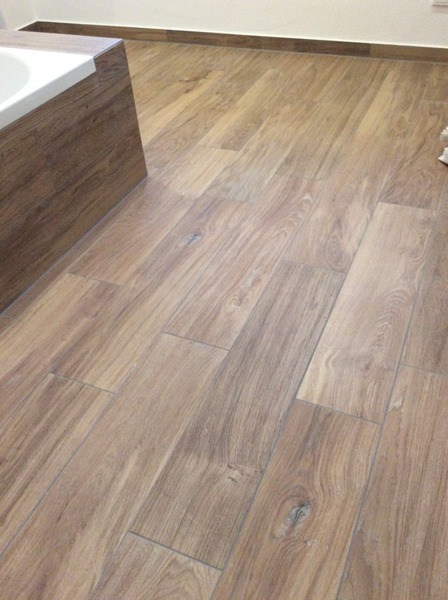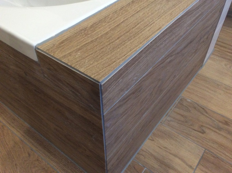Eckbadewanne mit LED Unterbodenbeleuchtung verleiht dem ganzen Bad ein besonderes Ambiente und setzt dekorative Akzente. Boden mit Holzoptikfliesen im Verband verlegt und Wandfliesen in Creme Weiß mit liniaren Seitwärtsstruktur. Mosaik passend mit Türkis Glaselementen und Feinsteinzeug geschnitten.