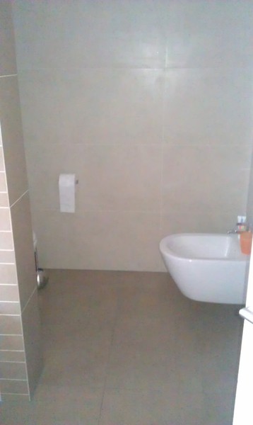 Wandfliesen in einem edlen, glänzenden Weiss Design und mit rektifizierten Kanten, sodass eine Fugenbreite von 2 mm möglich ist. Akzente mit unterschiedliche großen Streifen aus den Bodenfliesen herausgeschnitten und im Duschbereich und am WC individuell angeordnet.